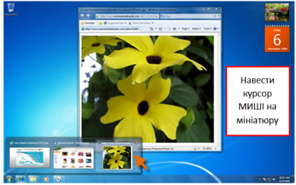 При наведенні курсору миші на групу вікон, функція Aero Peek покаже вам всі мініатюри вікон