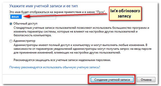 Перед тим як встановити батьківський контроль потрібно створити обліковий запис для дитини (коритсувача). Це повинен бути обліковий запис зі звичайним доступом (не можливо встановити батьківський контроль на обліковий запис адміністратора).