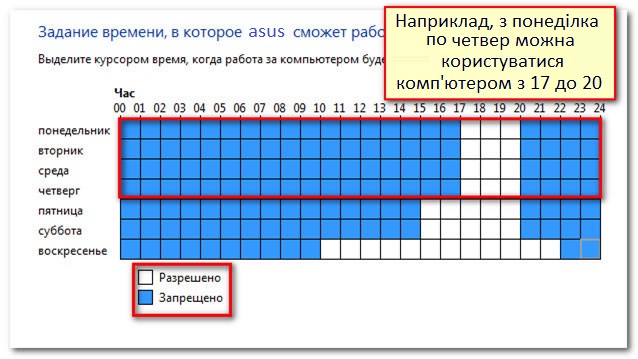 Налаштування обмежень за часом дозволяють контролювати, коли дитина буде користуватися комп'ютером. Натиснувши по будь-якому блоку, можна дозволити або заблокувати доступ в цей час. Також можна задати різні обмеження часу на різні дні. Наприклад, можна дозволити більше користуватися комп'ютером тільки у вихідні.