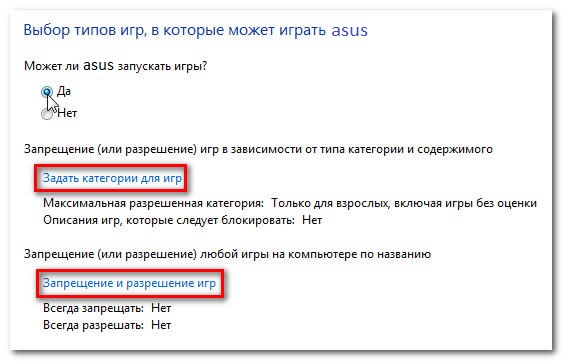 Налаштування «Ігри», дозволяє вибрати які категорії ігор (або певні Ігри) дозволити або заборонити. Спочатку слід натиснути Так, щоб дозволити дітям грати в ігри,а потім можна змінити налаштування доступу до Ігор.