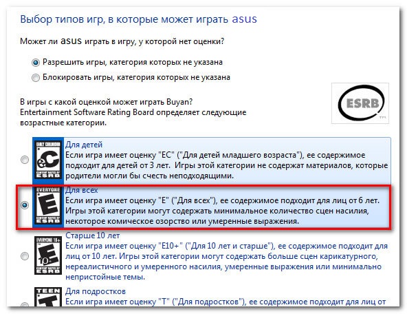 Тут вибрано «Для всіх» в якості вищої категорії дозволених ігор. Це означає, що дитина може грати в ігри категорій «Для всіх» або «Для дітей».