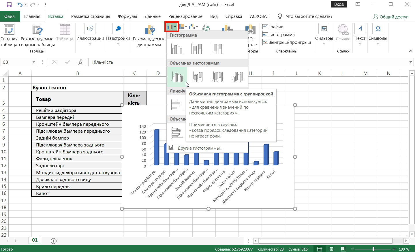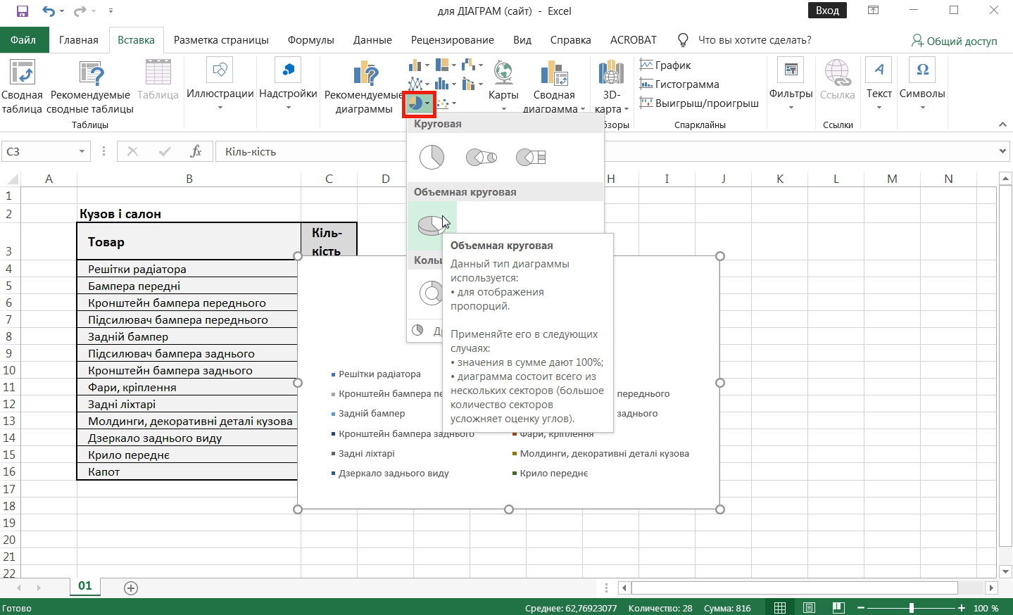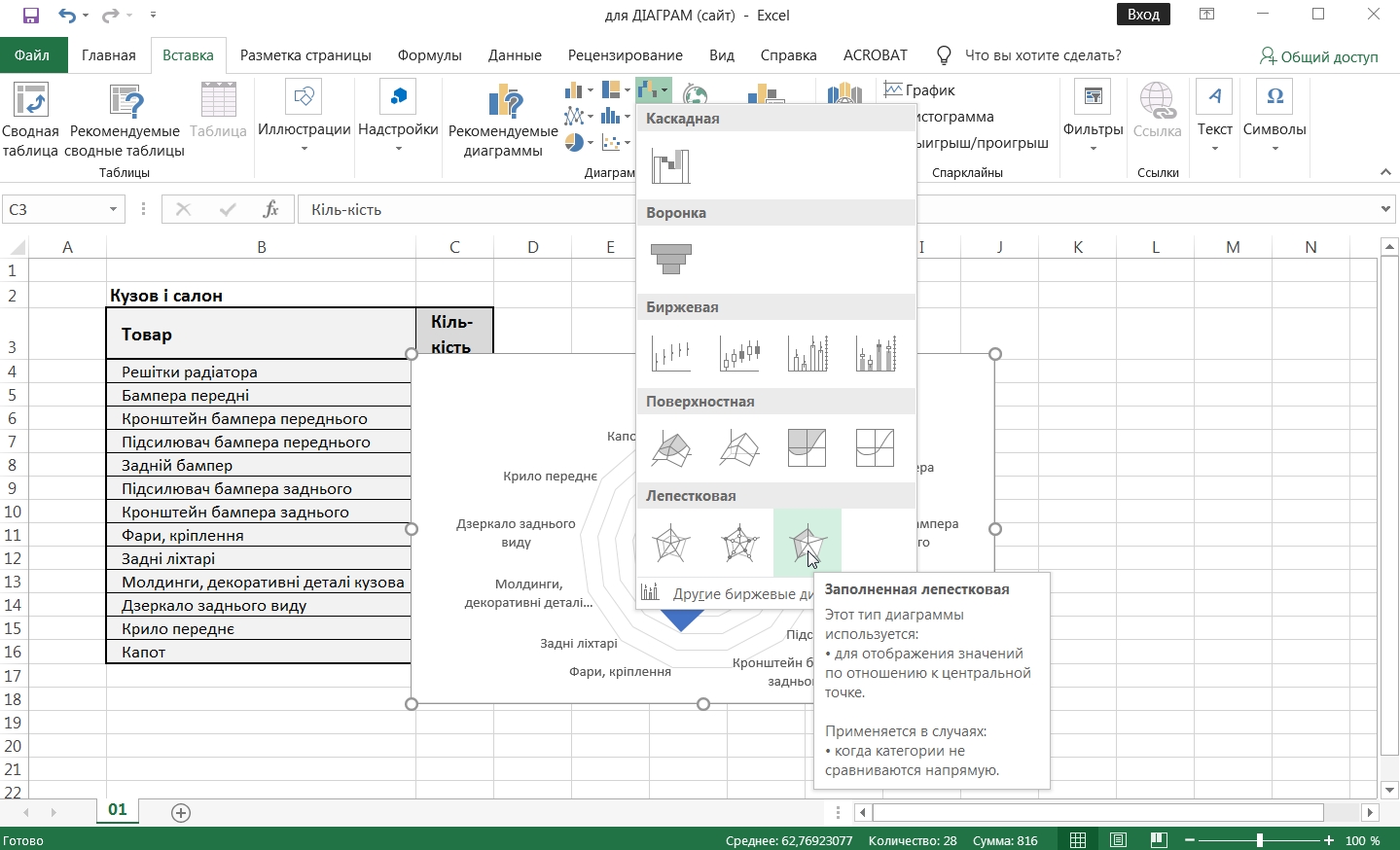 Побудова різних видів діаграм практично нічим не відрізняються. Тільки на певному етапі потрібно вибрати відповідний тип візуалізації.